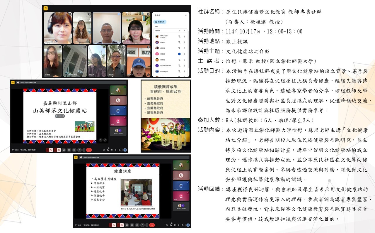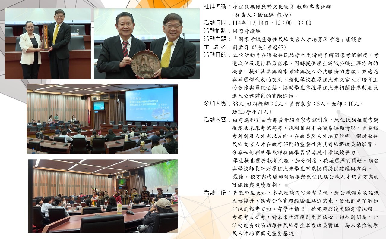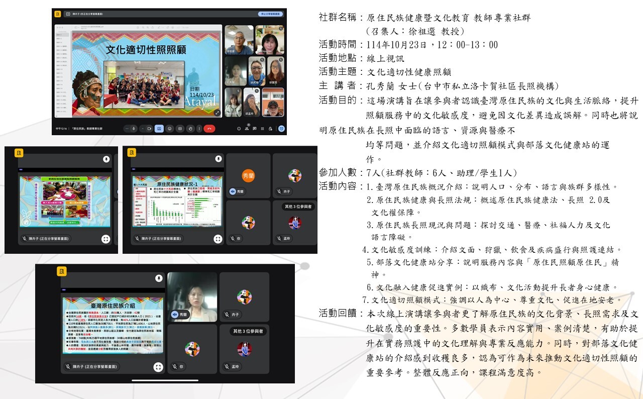 | 15 | 原住民族健康暨文化教育 | 徐祖選 教授 | 1 114/10/17 |
