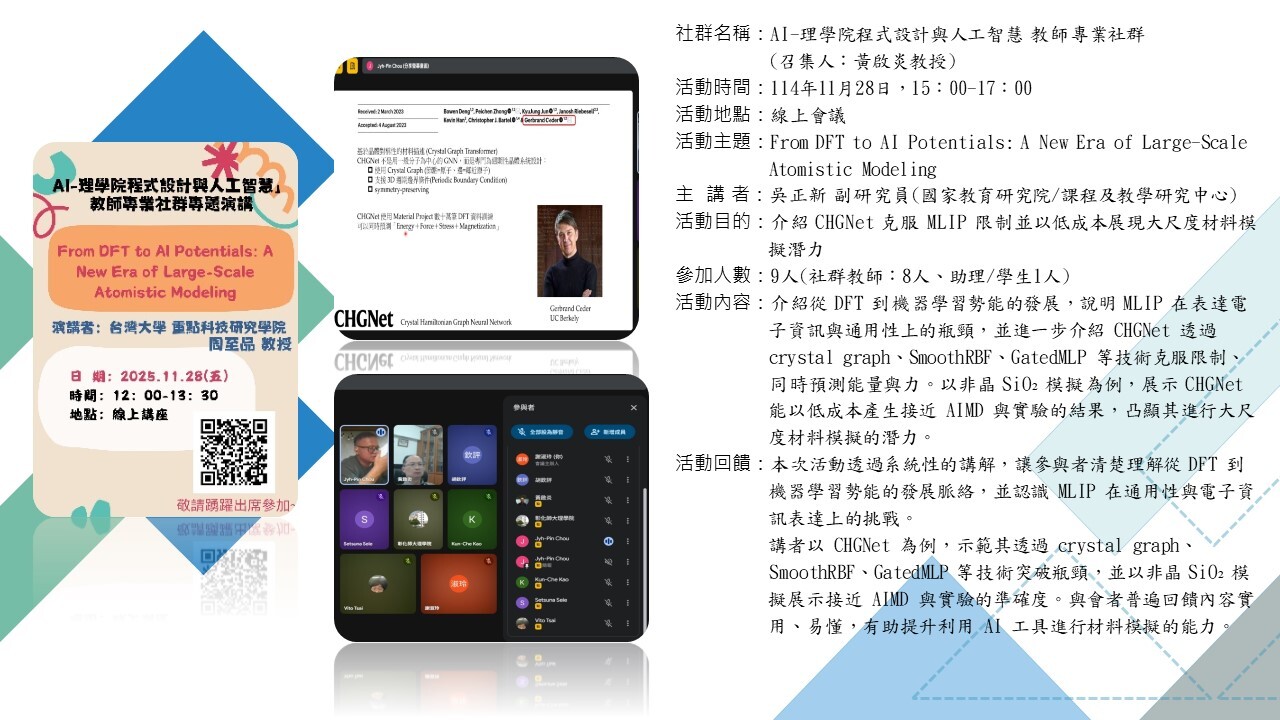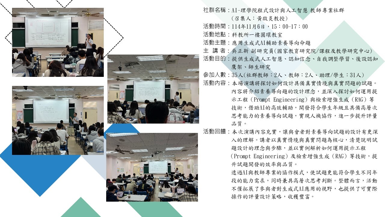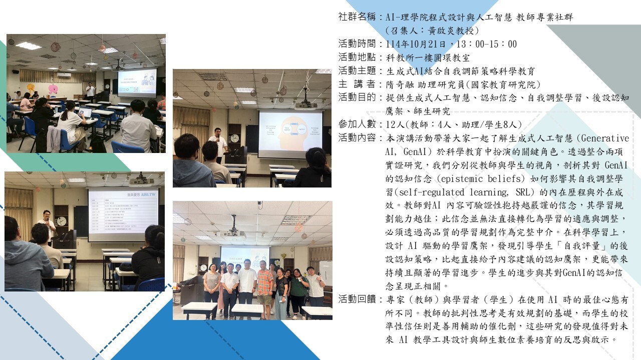 | 1 | AI-理學院程式設計與人工智慧 | 黃啟炎 院長 | 1 114/10/21 |