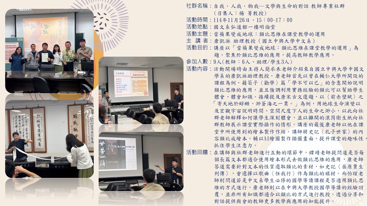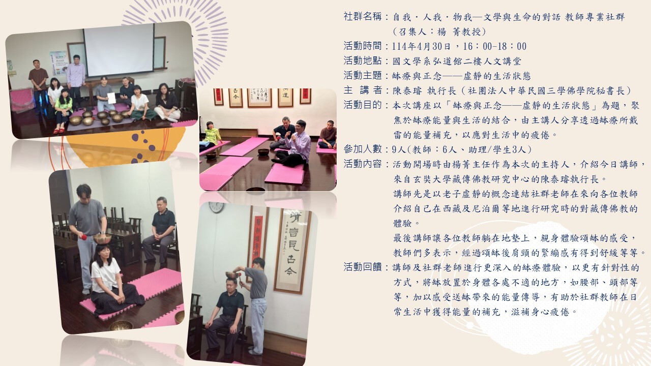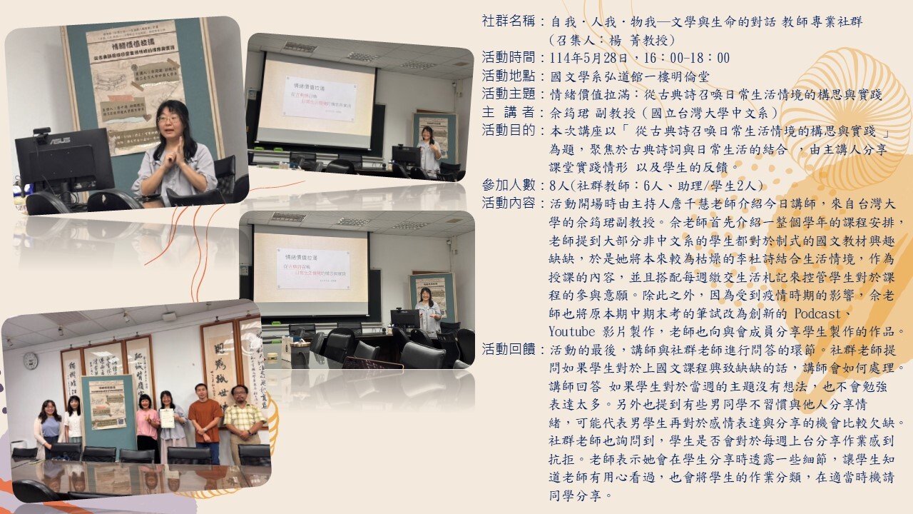 | 5 | 自我.人我.物我-文學與生命的對話 | 楊 菁 主任 | 1 114/4/23 |