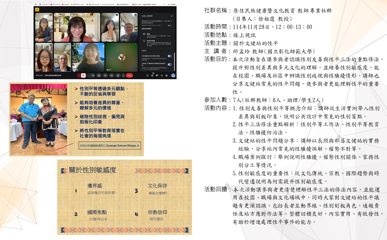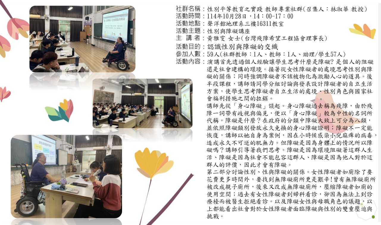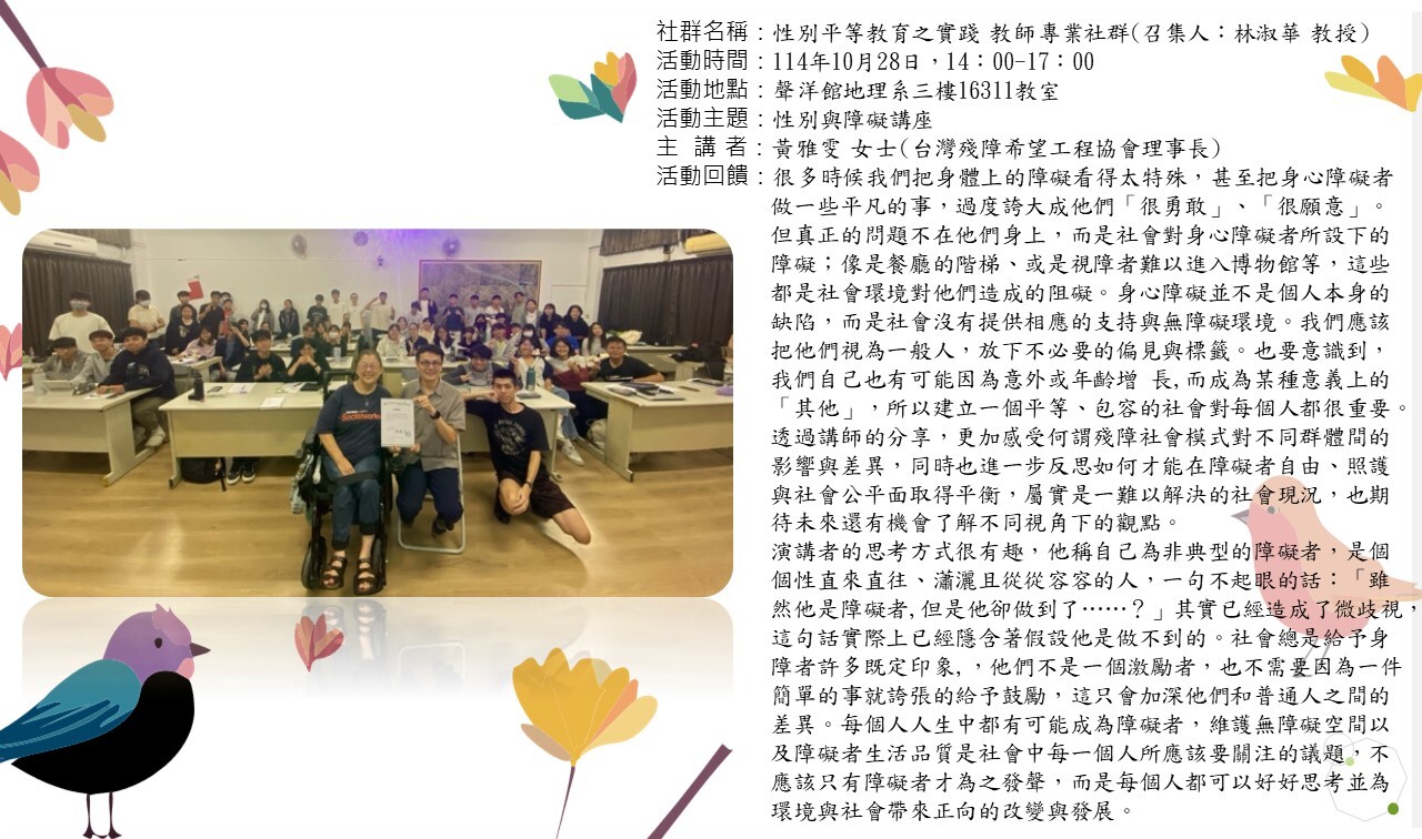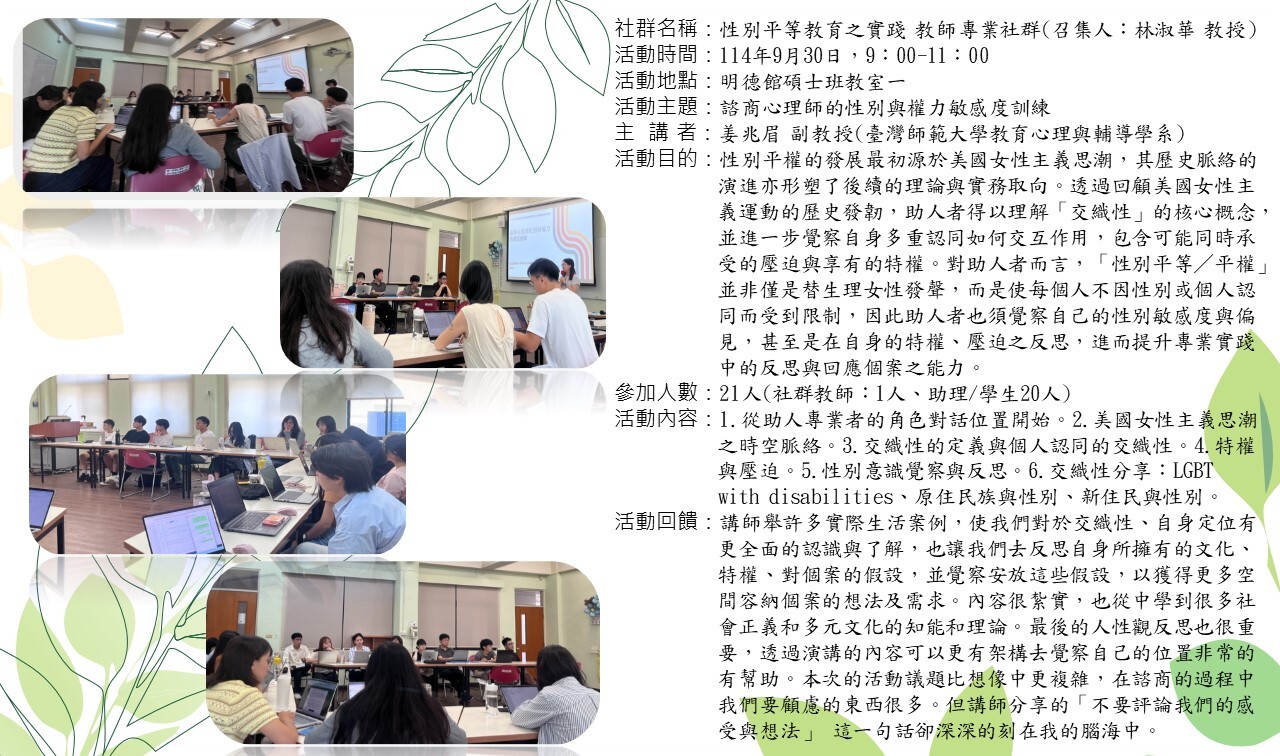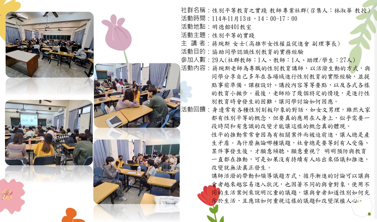 | 7 | 性別平等教育之實踐 | 林淑華 教授 | 1 114/9/30 |