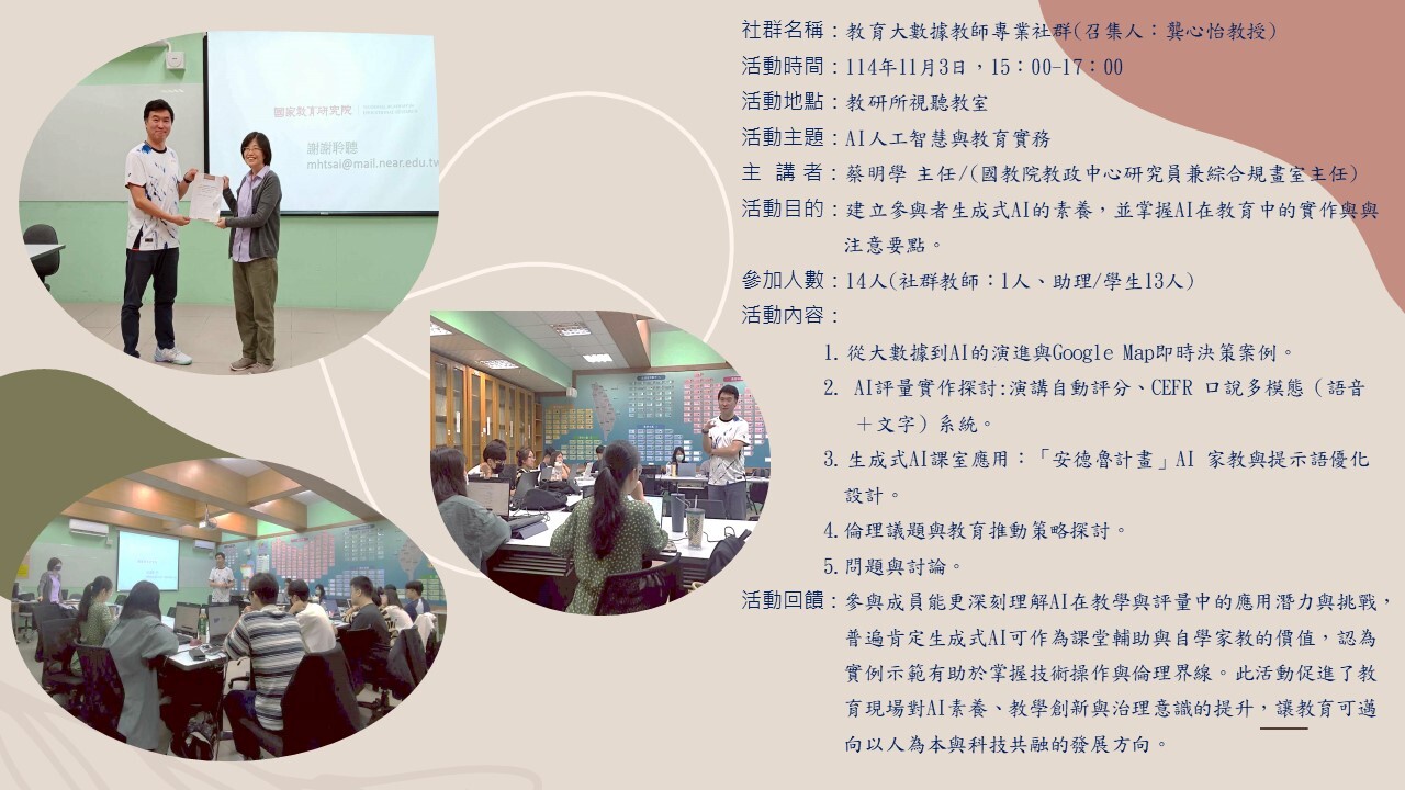 | 9 | 教育大數據 | 龔心怡 教授 | 1 114/3/28 |