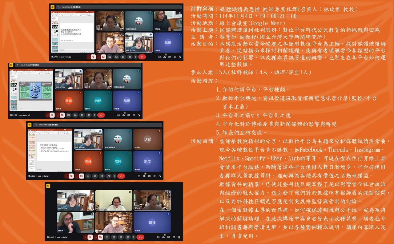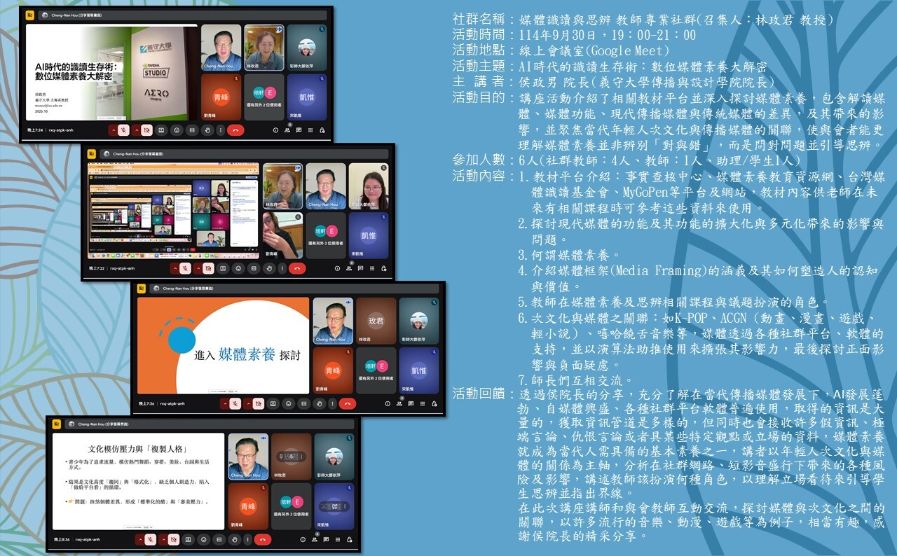 | 6 | 媒體識讀與思辨 | 林玫君 主任 | 1 114/9/30 |