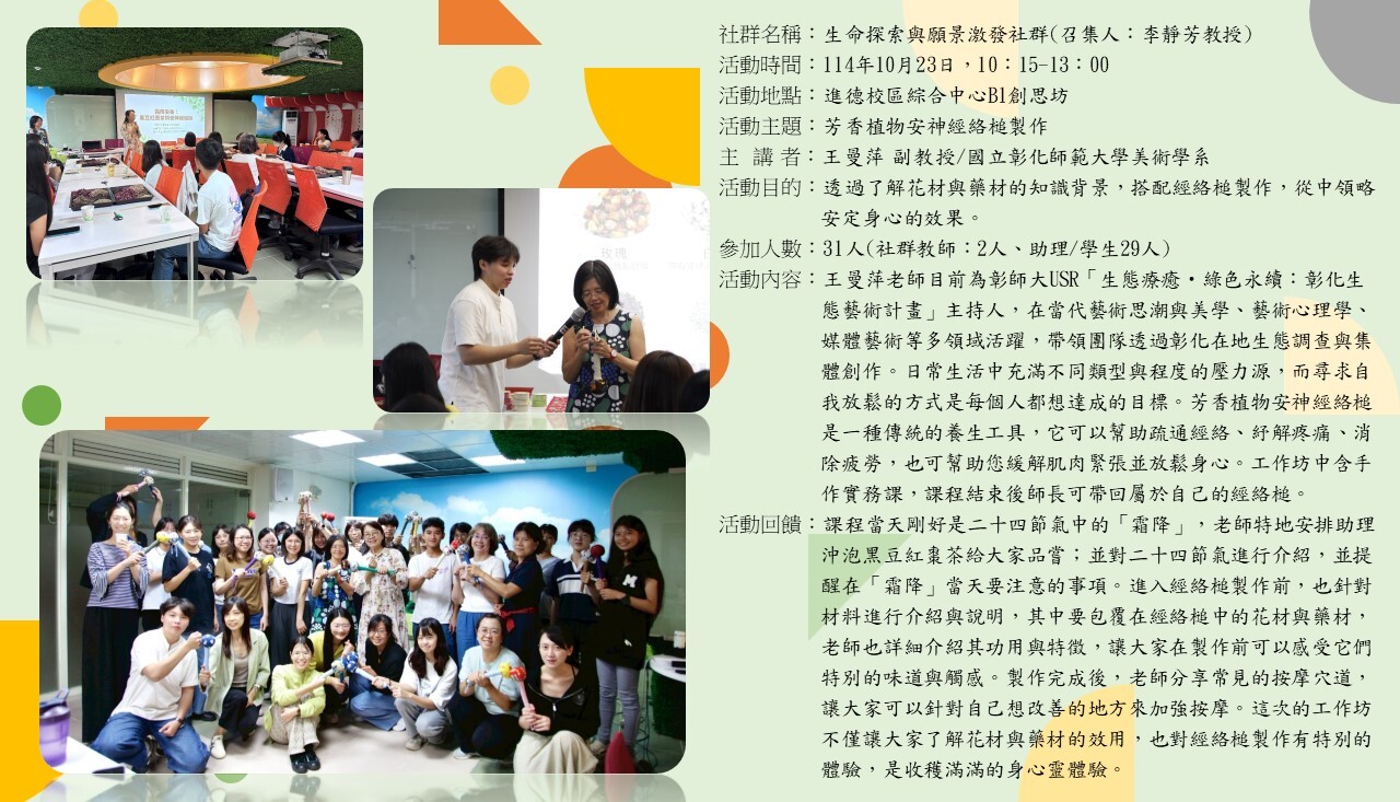 | 3 | 生命探索與願景激發 | 李靜芳 主任 | 1 114/4/22 |